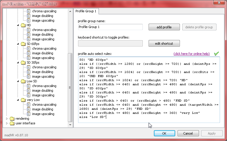 這樣看完應該稍微有點概念了吧,不過要編寫出自己想要的完整選擇機制的話,當然你必須很清楚你要讓什麼片源在什麼情況下使用什麼設置,這邊就必須先做大量的測試,觀察顯卡的負載狀況,並且記錄、整理,有了完整的邏輯之後才能把它寫成語法,然後再去測試和修正,這個步驟可能會相當麻煩而且辛苦,但完成後就能一勞永逸,所以不要怕麻煩。